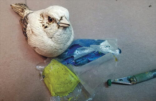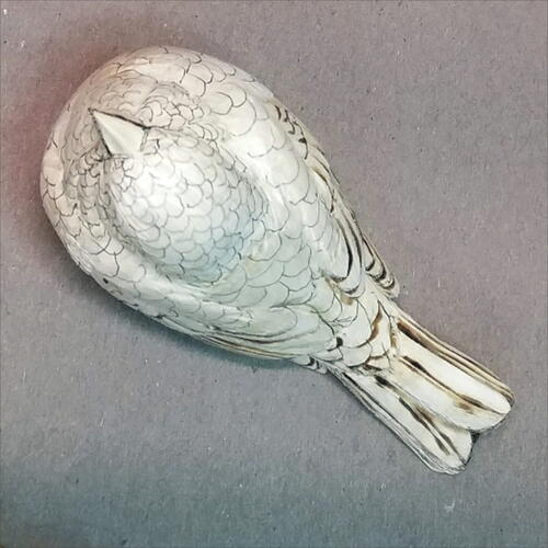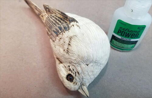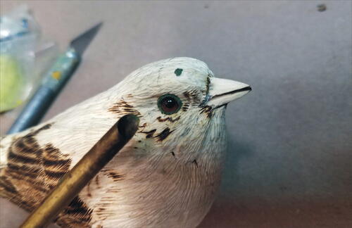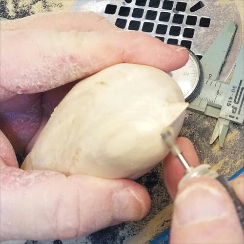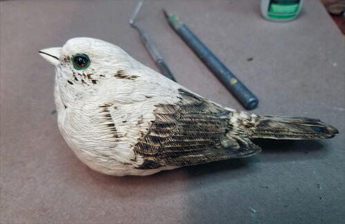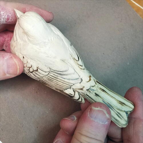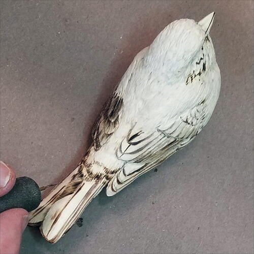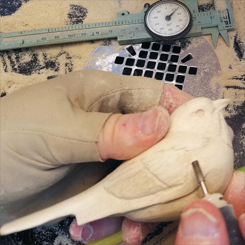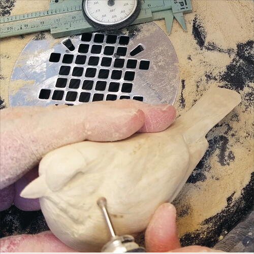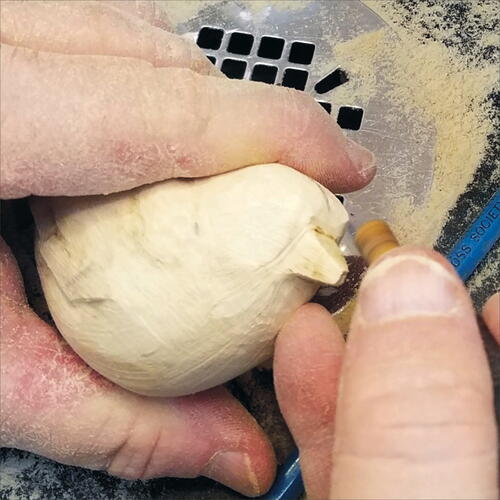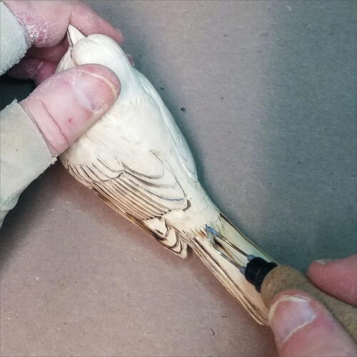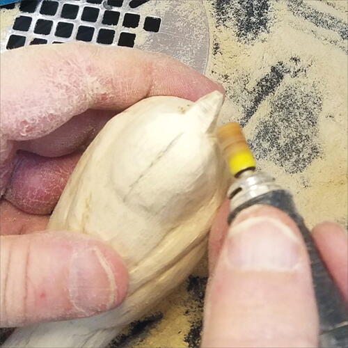 Round out the head with your micro-motor device and a flat-top, fine Saburrtooth burr. From the leading edge of the wing, round out both the back of the bird and the belly.