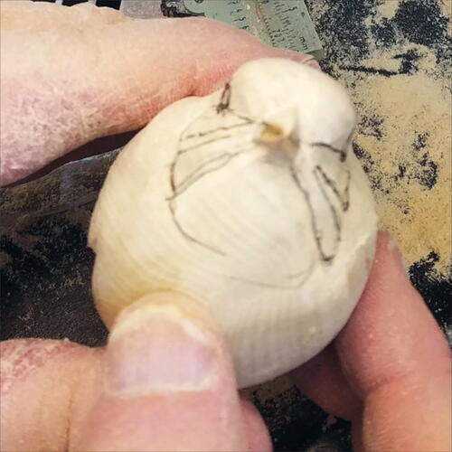 Using a larger flat-top diamond, lightly carve out the eye sockets and begin carving the lines drawn for the throat, malar region, and ear coverts.