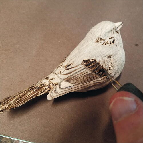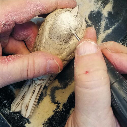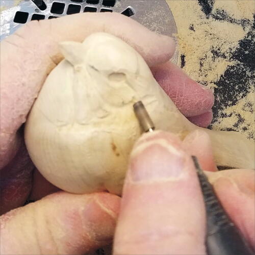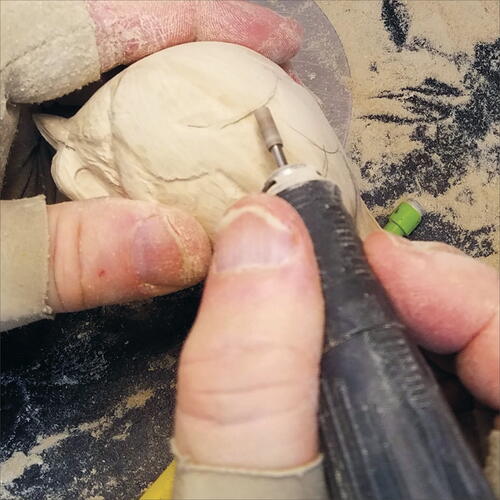 Using a round-top, fine Saburrtooth burr, begin shaping the rump as it relates to the side flanks. Be careful not to nick your primaries.