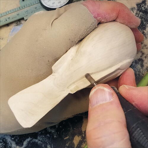 Use your Foredom or micro-motor and a fine Saburrtooth burr to carefully take the four corners off the blank from the back of the head/throat to the beginning of the rump. You should end up with a shape like a stop sign when looking at the blank head on.