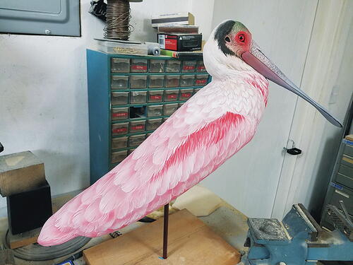 In this article, I will talk about turning a palm frond into a roseate spoonbill. For this piece, as well as any palm frond project, you will need the usual carving tools and paint. You will also need a liberal amount of imagination