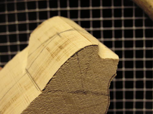 It is time to define the top of the head. Take the top view of the pattern and draw in the outer shape onto the block. As with the previous step, you will cut straight up and down to the centerline as you cut up to the line you drew. -