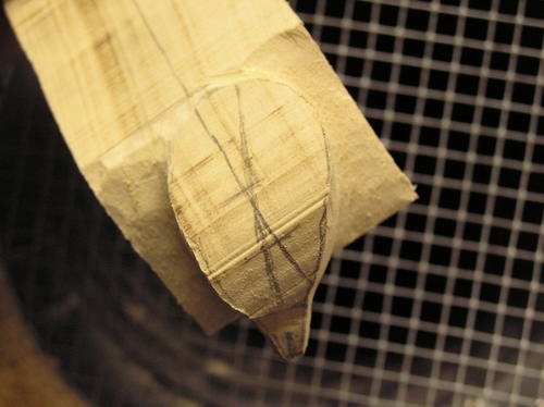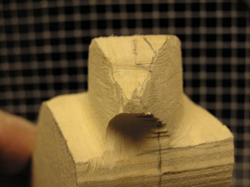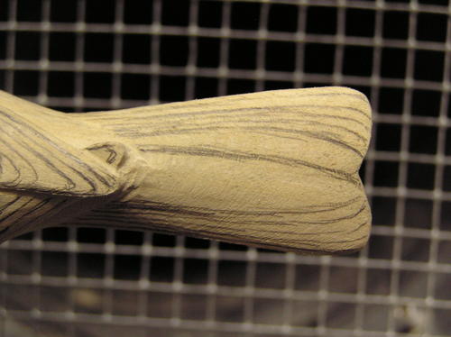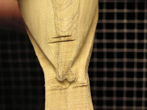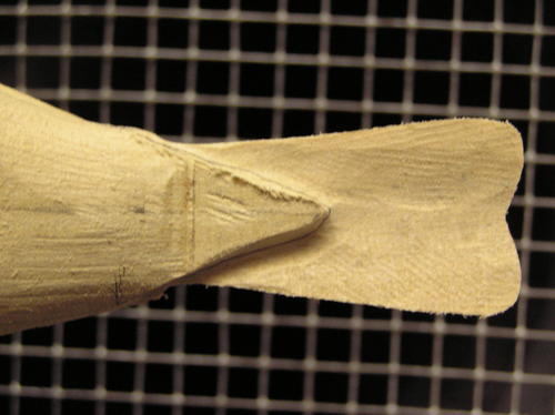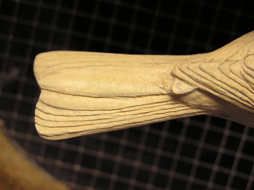 Rough in the tail by cutting up into the centerline on the underside, giving it an arched appearance. Taper the top slightly to the outside edge. Be sure to leave about 1/8 of an inch thickness on the outside of the tail for layering in the feathers during later steps. -