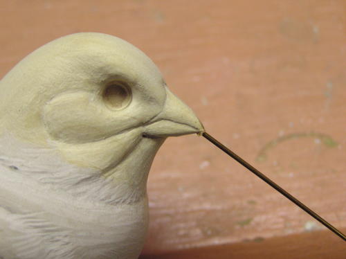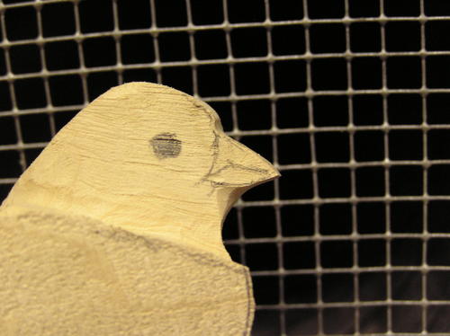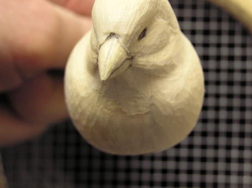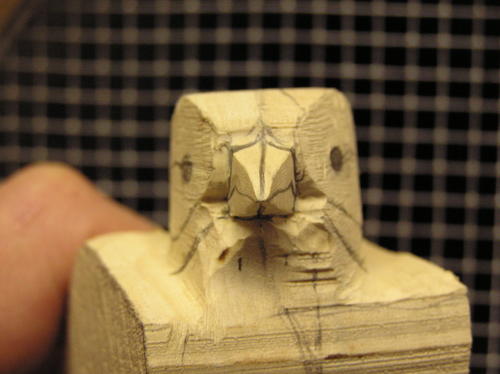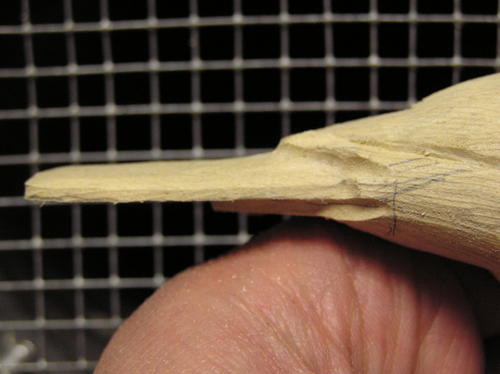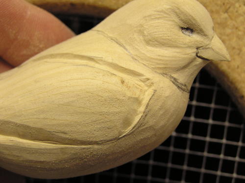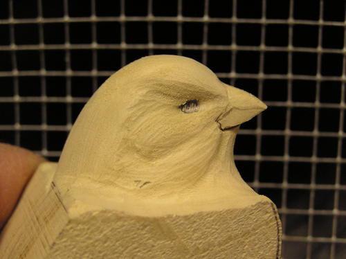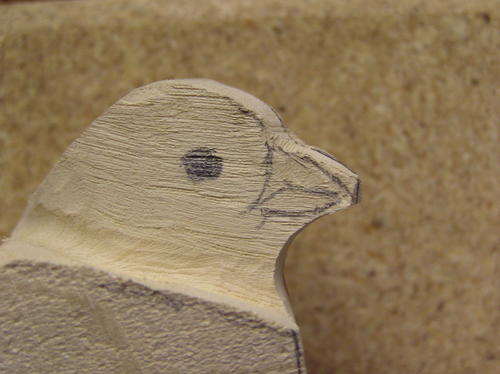 True up the beak at this point. Be sure to cut through your pencil marks or the beak will be too wide or thick. If necessary, recheck the shape with the pattern. The second image shows some further refinement of the beak along with identification of the cheek patches. -