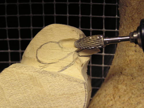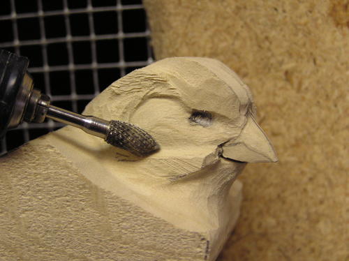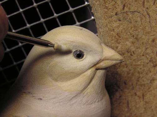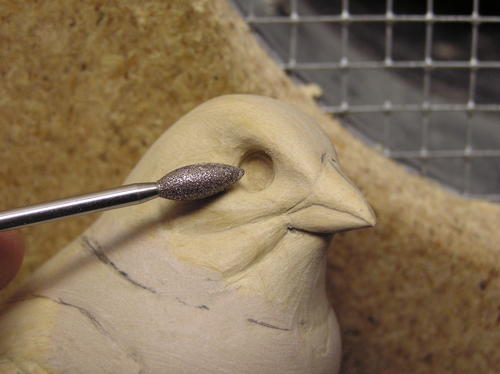 Verify the proper placement for the eye, assuring balance from left to right and up and down. Draw a 4 mm circle to indicate the eye socket. Using a carbide cylinder, cut straight into the head with a slight forward angle. You can verify the opening by placing the eyes into the holes. Assure proper depth by measuring between the outside of the right and left eyes. Refer to your pattern for this measurement. Once you’ve established the depths, eliminate the harsh edge by rolling a diamond or ruby flame bit out of the eye socket into the feathers all around the socket. -