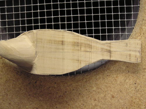 You need to shape the body before melding the head into it. Use the top view pattern and outline the body and tail on both the top and bottom of the block. Cut straight to the lines, leaving a squared body and tail. -