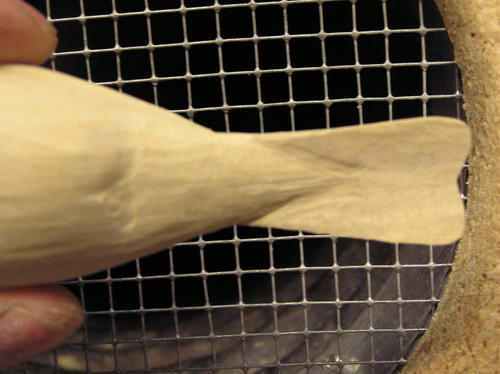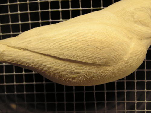 Identify the widest point on the bird’s body. This will be just above the lower edge of the wing as viewed on the pattern. Round the top of the body down to this line and the bottom of the body up, from the belly centerline, to this line. Keep a rounding motion going at all times so you don’t get any flat areas. Look down the body periodically to see that you are getting a round look as you view it from the front or back. Once it appears round, you are done. -