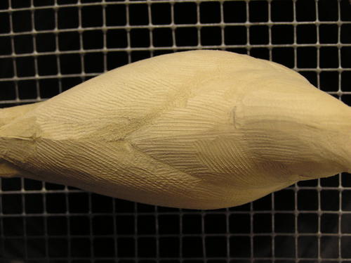 This pattern has the wingtips crossing over the back. Leave wood outside and below the wing line to represent the flank feathers if this is going to be a puffy bird. If the bird’s wings are outside the belly and breast feathers, then you will want to cut under the wing. When you have the straight cuts, you can round off the harsh edges as shown in the second image. -