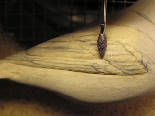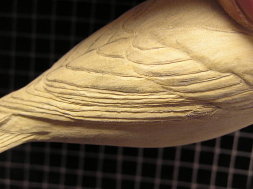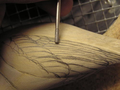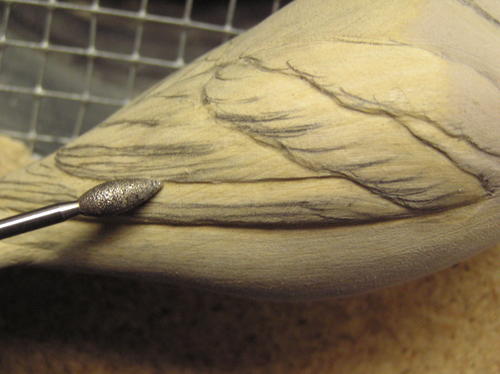 The wings and tail are the only areas in which I cut and shape individual feathers. Starting with the wing, draw in feathers for each of the feather groups except the scapulars. Try to create a random feather layout for a more natural look. If it’s too uniform, it will create a stiff look to the bird. Using a safe-end diamond cylinder bit, cut around the lower edges of all these feathers. -