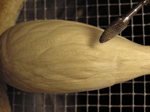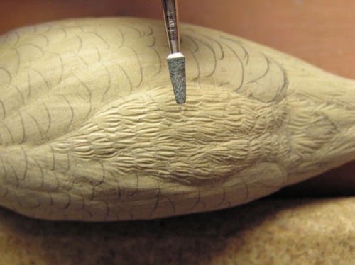 In the breast, belly, under-tail coverts, and cape, create flow lines radiating out from the centerline and to the tail. Randomly connect one flow line with another with S curves and arcs so it appears graceful. Once you are pleased with the look and flow of these groups, cut them in with the diamond flame. Be sure to vary the depths of these cuts. Typically, you will have shallow cuts in the breast and deeper ones in the centerline area and as you get to the back portion of the belly and flanks. -