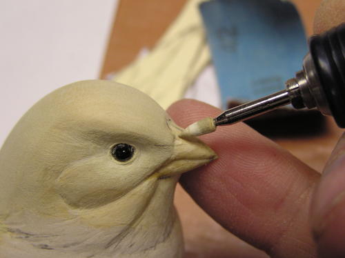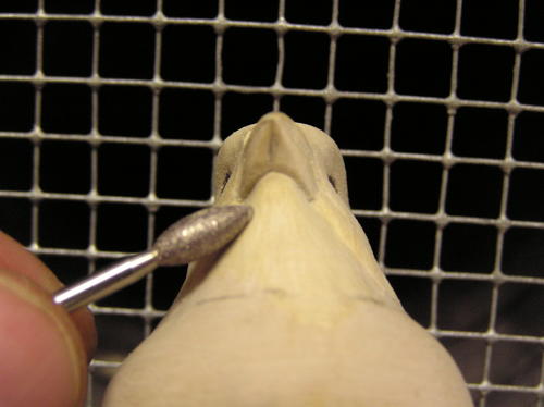 Round the upper mandible up to the top centerline, with the lower edge having a slight roll under (into the crease). The lower mandible will have more of a flat bottom while still having a rolled lower edge. It too will roll in at the upper edge (into the crease). This is the time to create the inset appearance of the throat feathers as they set up under the lower mandible. -