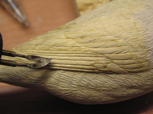 The tertials, secondaries, alula, and the various wing coverts, which we defined earlier, are semi-hard feathers. Use a hard stone or ceramic stick to texture these feathers. The stoning gives them a little softer look than burning and helps the transition from hard to soft feathers. Each line should be as fine and tight as possible. -