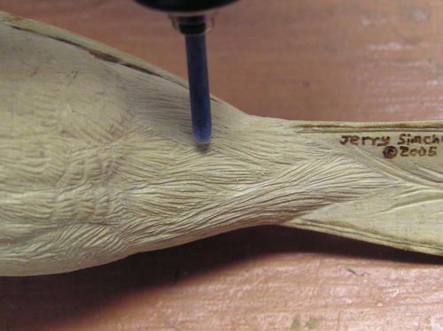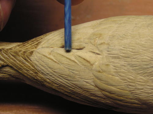 The primary and tail feathers are hard feathers. Burn them in with a fine burning tip. Burn each line so it is as fine and tight as possible. Shallow is better than deep. -