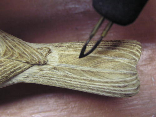 I define splits and quills with the stones and burning tips. I start with the stone to define the splits and then follow up with a flat-edged burning tip. I burn the quills with this flat-edged burning tip. -