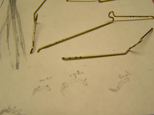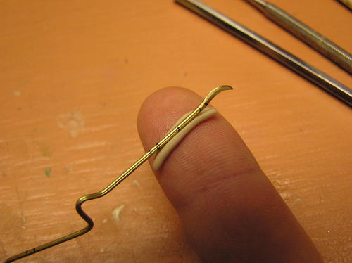 Use a brass rod for the core of each toe, and mark each joint on the rod for future reference. The ends will represent the talons. The size of the rod is based on the minimum thickness of the toes. I make sure to go smaller than the thinnest part of any toe so there is enough room for the epoxy buildup. -