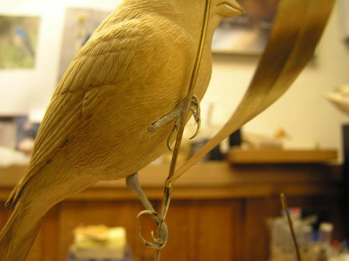 At this point, it’s important to begin looking at the bird’s placement on the habitat. When placing the legs to the habitat, make sure the bird is balanced when set on the legs. With the legs in place, form the toes around the habitat. Working from one toe to the next, bend each one at its joints so that it lays naturally around the habitat. Check reference photos if necessary. -