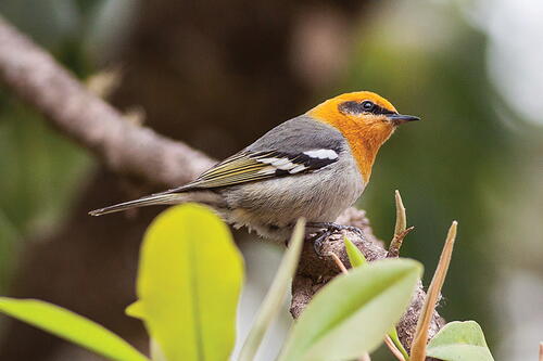 The olive warbler (Peucedramus taeniatus) has a yellow-orange head with a black ear patch. It is described as being relatively long, measuring between 5 and 5 1/2 inches in length, with a slender bill, long wings, and notched tail. The orange head of the adult male takes up to two years to develop.