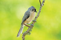 The tufted titmouse (Parus bicolor) is the largest North American titmouse, measuring between 5½ to 6 inches in length. It is the eastern counterpart to the Western plain titmouse and is described as plain gray, although it can vary in color slightly from area to area. The tufted titmouse has a large head with a crest that the bird can raise or lower. It has a stout black bill and a black patch on the forehead.