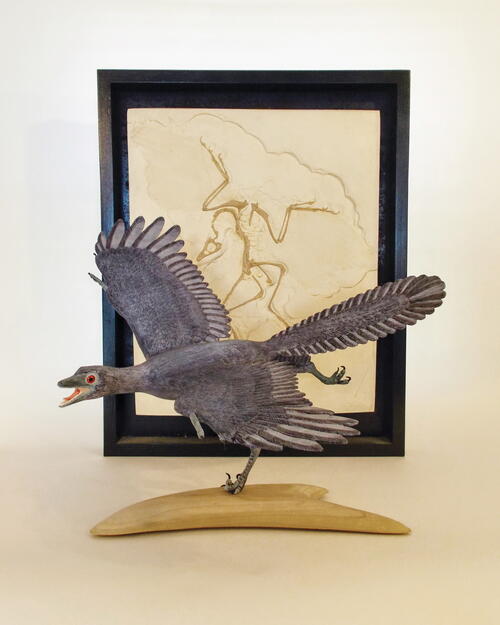 One of the most iconic and widely recognized fossils in the world is that of the Berlin specimen of the avian ancestor Archaeopteryx lithographica, discovered around 1877 in a quarry near Eichstätt, Germany. This and other Archaeopteryx fossil discoveries seemed to confirm the theory of evolution described by Charles Darwin in his 1849 publication, The Origin of Species. Archaeopteryx appeared to be a clearly transitional form that combined the feathered wings and body of a bird with the teeth, forelimbs, and long bony tail of a reptile. I have long been fascinated by this fossil and by ongoing discussions about the origins of birds and the relationship between birds and dinosaurs, so I decided to do a woodcarving project depicting the Archaeopteryx.