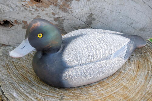 I never tire of making or studying Ward Brothers decoys! This scaup—or bluebill, broadbill, blackhead, whatever your name for the species is—was our subject in the annual Smoker Brothers Carving and Painting Seminar held every April in Ocean City, Maryland, and sponsored by the Ward Museum of Wildfowl Art. Our decoy was carved from white cedar. To achieve the textured surface, we used modeling paste and marble dust instead of the Wards’ white lead. We stippled the back and sides. Painting was accomplished using oils, but you can use acrylics instead. The bill on this bird was painted on, not carved.