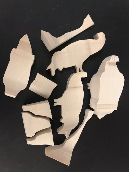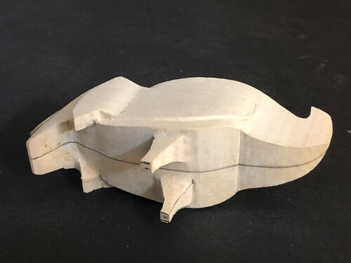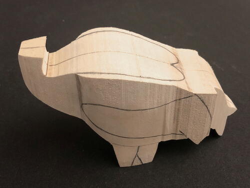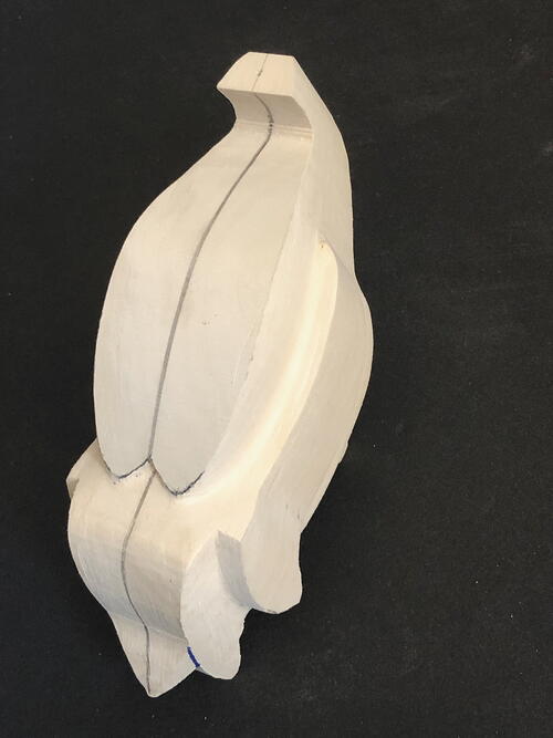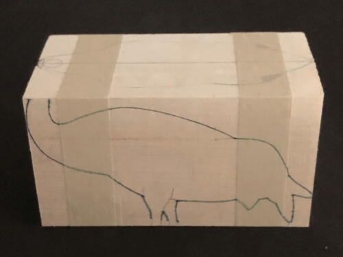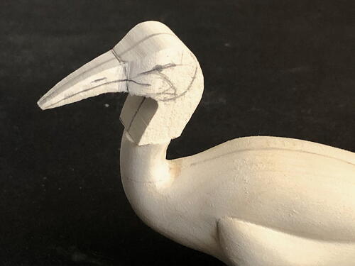 Using the pattern as a guide, I draw the major feather groups (but not individual feathers) on the blank. I will carve away some of these lines before they are used but it’s useful to have them there so I know where I’m heading.