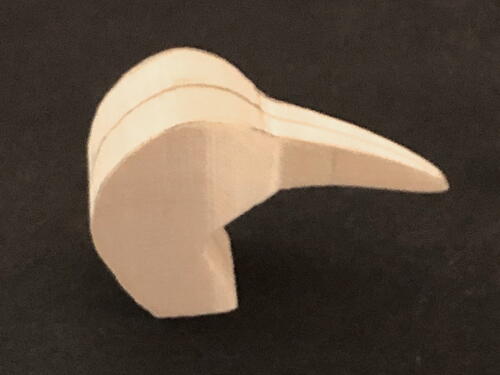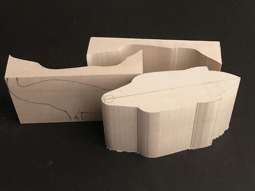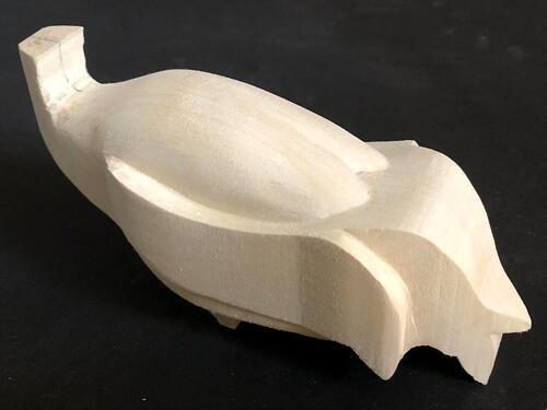 For the head/neck portion I cut the side profile first. I then place the head back on the bottom off-cut and roughly cut the top view on the band saw. I cut the top view a bit outside the lines, leaving everything slightly oversize. This will allow minor adjustments, especially in the bill and neck areas. Note: This operation puts your hands close to the band saw blade as the part is very small. Anyone who is not experienced and comfortable with the band saw should consider doing this by hand (knife or coping saw).