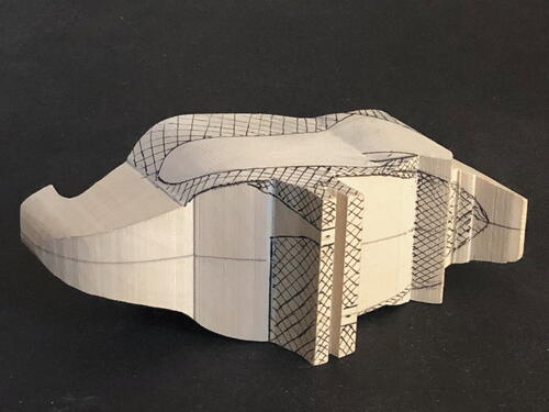 The underside of the crane is ready for a bit of landscaping. I sketch in the lines and then go around them with a small diamond ball.