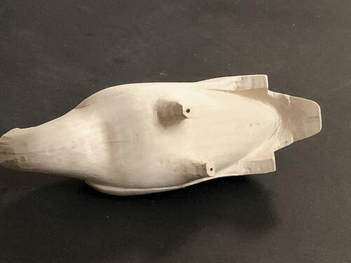 One weak area on the blank is the upper legs (“drumstick”) area where cross-grain leaves it susceptible to breakage. To add temporary strength, I drill holes for the legs and then insert pins into each hole. I cut the pins (brass rod) short enough that they won’t interfere with the carving but long enough so I can remove them with pliers before I insert the real legs. These pins will add strength and prevent cracking while I work in this area.