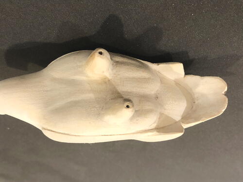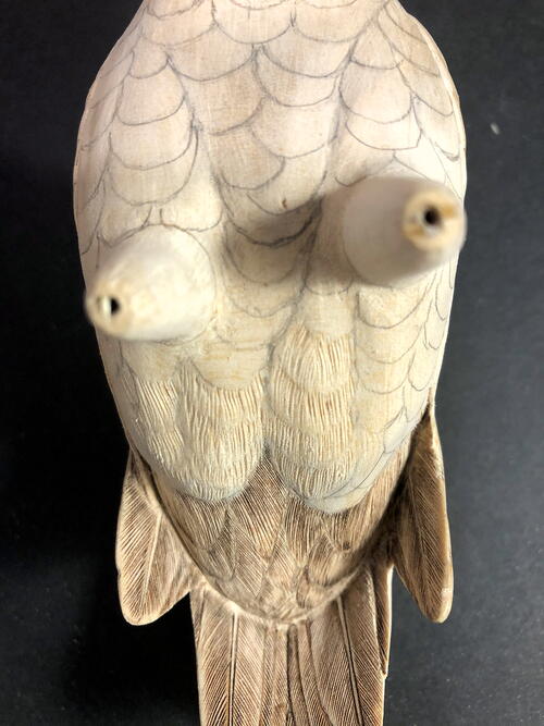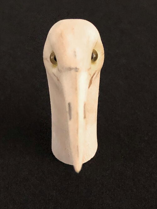 The head has been temporarily attached with a wire pin but no glue. I prefer to keep the head separate for ease of working while setting the eyes and carving the detail. The wire pin generally holds the head firmly enough to allow power carving the neck area. If not, you can use a small spot of hot melt glue to hold it temporarily.