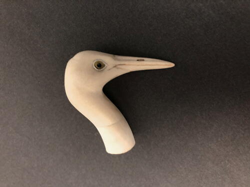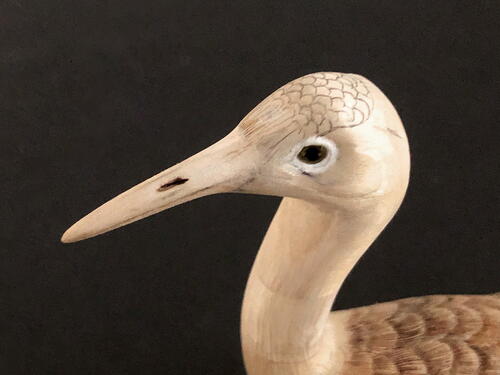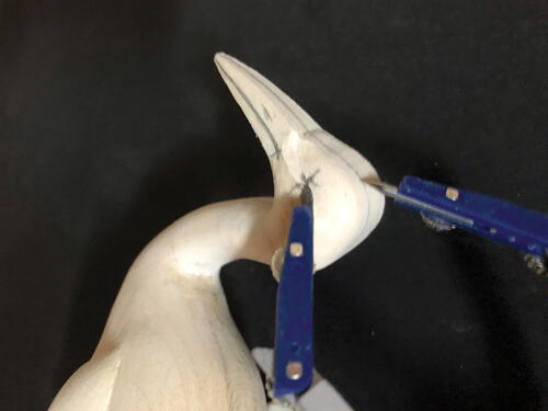 Here is how I position the eyes. Referring to the pattern, I transfer the position of one eye onto the blank with a compass or caliper. Then I use a special compass with articulating arms to transfer the position to the other side of the head. I take a measure - ment from the center of the bill tip to the center of the eye and transfer that measurement to the other side of the head.