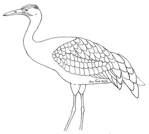 I have sketched individual feathers on the cape, back, and wings. Except for the bustle, individual feathers don’t stand out and the crane appears very smooth. In fact, it is very difficult to discern feather patterns even on the best photos. With white birds like this crane and the egret, it helps to search for images of the juveniles, where color differences better define the individual feathers and feather groups.