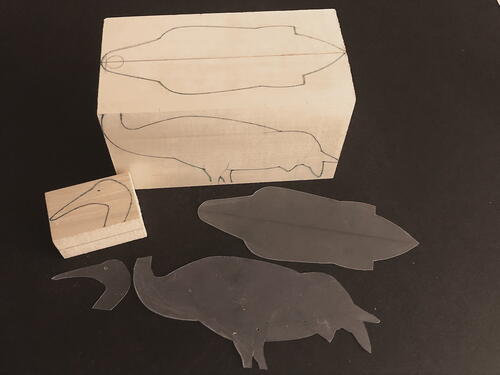 I first cut the top and side profiles of the pattern from template plastic and use them to transfer the pattern to a basswood block approximately 51/2" x 3" x 3". I will cut the head separately from the body. That will make it easier to give the head a slight turn. It also allows me to align the bill perfectly with the grain.