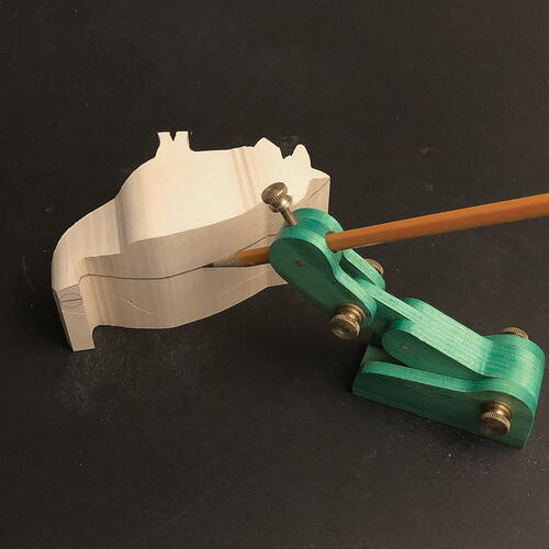 It is important that the band saw blade is exactly 90 degrees to the table surface so I always check this before cutting a blank. Once that’s established, I make sure the block is square on all sides. Then I align the two templates on the block and cut around the top profile.