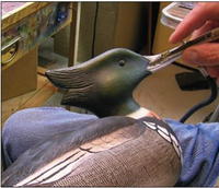 Carving this decoy couldn't be simpler, but I will paint this red-breasted merganser with a little more finesse than what you would normally find in a hunting decoy. My colors will not be any different, but I want to demonstrate some hand blending and a little airbrushing and a little toothbrush spritzing.