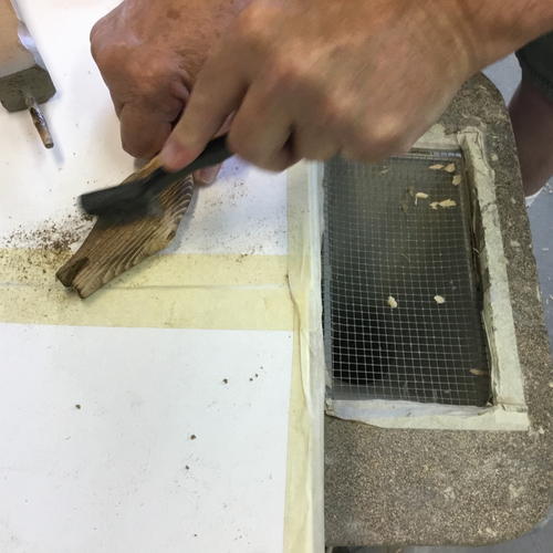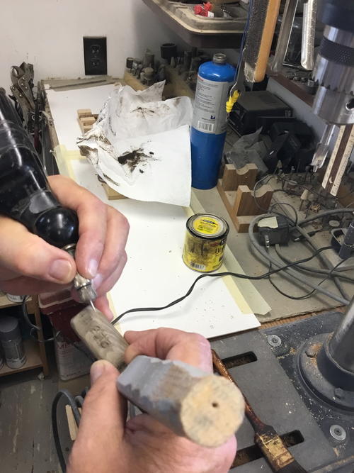 -             Using a stiff wire brush, Gary cleans up the burn marks. Notice how much the wood grain shows. This will add to the aged look of the bird.