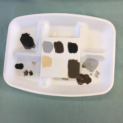 -             A Styrofoam picnic food tray provides a great place to put your paint. Shown here are various paint colors you can use for these shorebirds. The gray is a combination of black and warm white. Gary will also use burnt umber, raw umber, and yellow with warm white. The final coat is walnut stain.