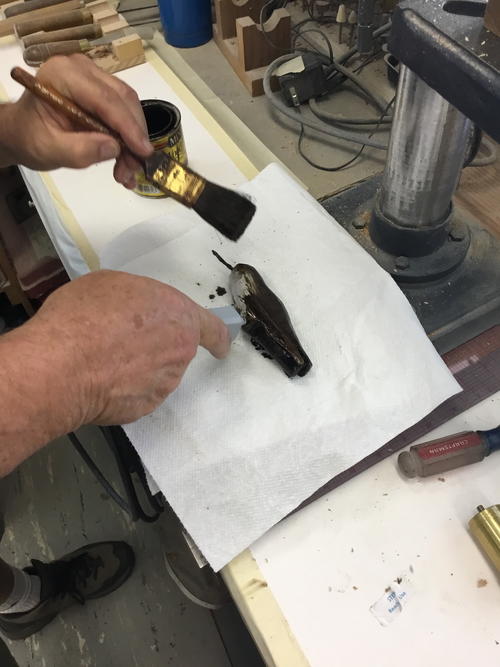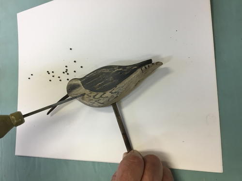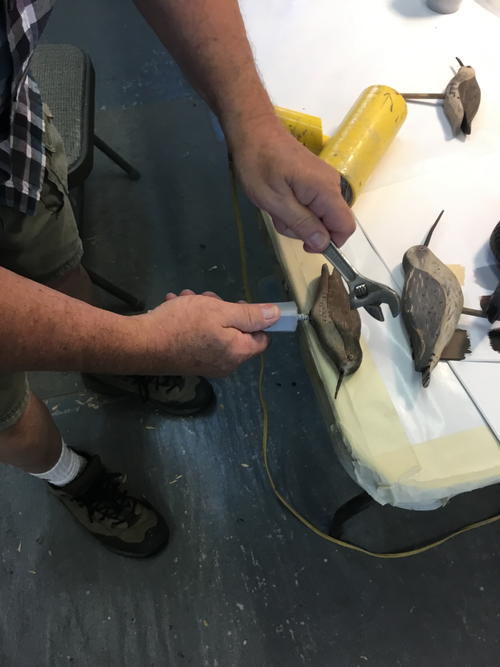 -             Gary takes his cutouts and dabs on the eyes on each side using the epoxy-and-sawdust mix. The bills are the old pieces of found metal or a square nail.