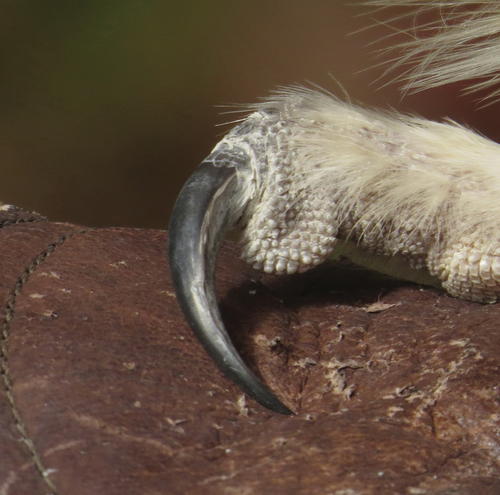 The large feet, including talons, can measure up to five and a half inches wide when fully opened. An interesting feature of great horned owls is a semi-pectinate talon located on the inner side of the second (or middle) talon. This feature is more like a rough-edged ridge rather than the fully developed comb-like extension on a barn owl’s talon. It is also found on some herons and nightjars. It is believed that barn owls use this feature for grooming and preening. It is unclear why the great horned owl has it. It might be used for holding prey.