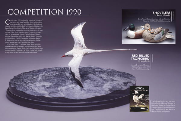 Competition 1990 continued to expand the coverage of the competitive world by adding shows to the publication's lineup. The new arrivals included the California Open in San Diego and the Birds in Art juried exhibition at the Leigh Yawkey Woodsen Art Museum in Wausau, Wisconsin. These two shows continued to appear in Competition for years to come. Other shows that were new to Competition's pages were the second annual Dremel/Ducks Unlimited Masters Carving Competition, which took place in Racine, Wisconsin, and the Chinook Carvers Competition in Calgary, Alberta. It also featured work by carvers who would become familiar names, among them Larry Barth and Bob Guge.