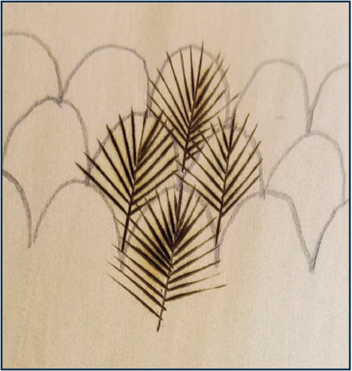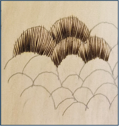When texturing or burning the feather pattern, I recommend starting with a line down the middle (the shaft) and continuing the process with a line that angles slightly to the left of the center. Then go back and repeat the process with a slight angle to the right of the shaft. To help understand how this appears, take a look at the next real feather you find. Take a piece of paper and lay it over the entire feather except for the last half inch or so. Leave that part visible and take a really good look at it because this is the part of that feather that you will see in the feather layout on a carving.