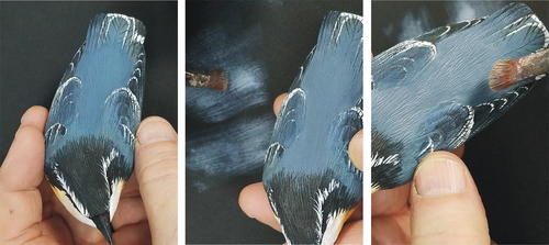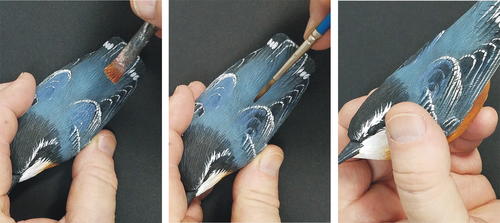 You will find that bird carving provides a ton of opportunities to blend different hues. Bird feather colors are often varied and dynamic. With acrylic paint, the blending medium is water. If you want to mix two colors on a tertial feather, take the worn-out brush and wet the surface of the feather until it is a little damp. Take another brush and apply the wash color on the wet surface. Watch the color of the feather blend with the wash color. If you have too much or too little moisture, you will not get the desired blend. Getting the moisture just right takes some practice, but it is not a complicated process. -