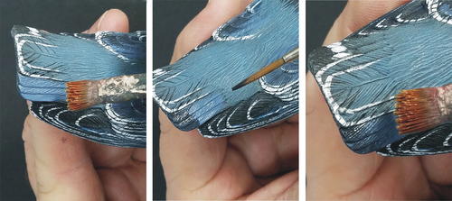 With the two-brush blending method, you want to keep the worn-out brush damp. Wet the surface, paint the two colors you want to blend on the feather, and use the damp, worn-out blender to gently mix the two colors while the paint is still wet. Once the paints dry, you will not be able to blend.