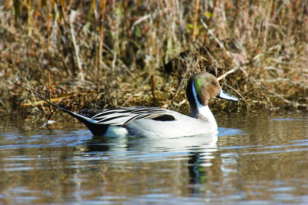 A long, slender neck, distinctive head shape, and tail feathers that make up a full one-quarter of its total body length give the pintail an elegant, graceful look. Some describe the drake as having a royal air about him. The shape of hte bill also adds to its regal appearance. The upper surface of the bill slopes rather sharply downward from the skull to a nearly flat area about halfway from the tip.
