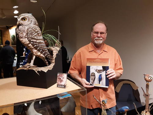 Tom Baldwin proudly displays a copy of his new book, Three Bird Carving Projects.