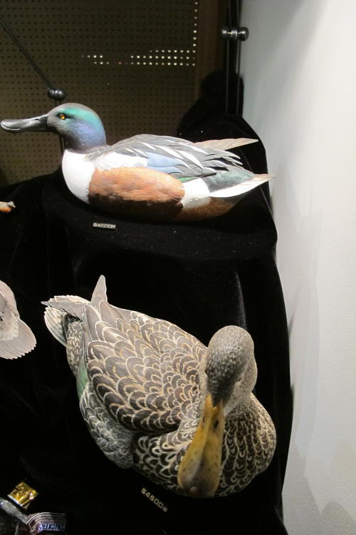 The other carvers in the art museum’s rooms were displaying an amazing array of carvings—almost all of them birds. Al Jordan, another contributor to Wildfowl Carving Magazine, brought his stunningly realistic hawks and owls. Doug Mason and Glenn McMurdo had intricately carved and painted waterfowl. Mark Madden specializes in owls. Other carvers brought songbirds, shorebirds, and eagles. Tom Horn has made a name for himself with his beautiful tropical birds, which shimmer with iridescence from his painting.