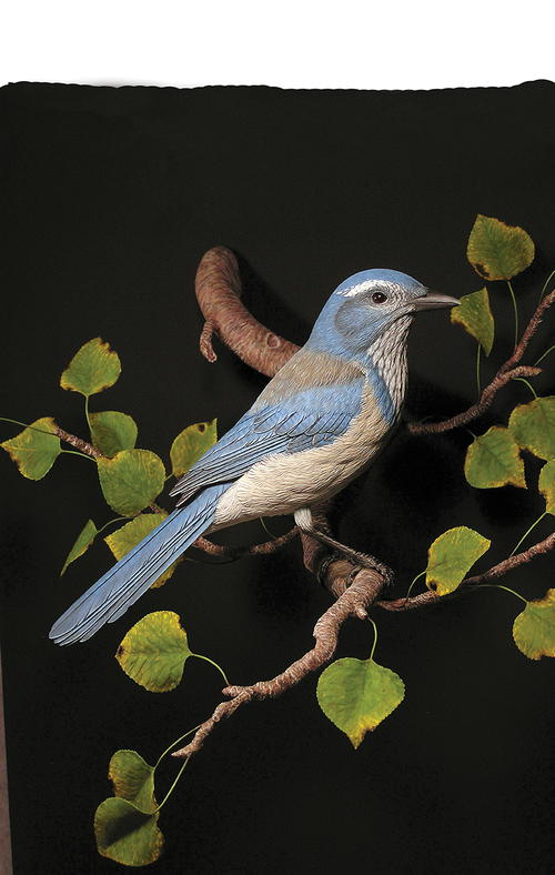 For some time now, I have wanted to do a wall mount presentation with one of my carvings. The scrub jay seemed to provide the perfect opportunity—provided I could make an equally good branch for it. The habitat presented its own challenges, but it was quite rewarding when I finished it. This presentation method creates a unique viewing opportunity for this sculpture.