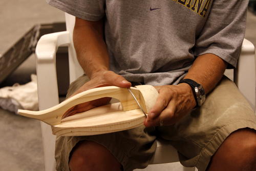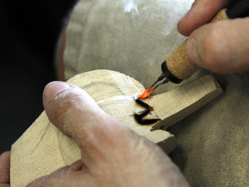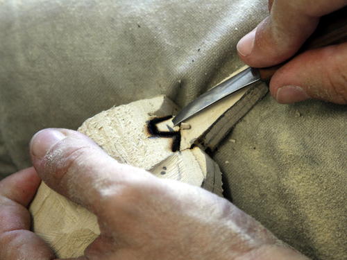 -             With a tack hammer, tap in the tag end of the wire rib into the first hole. Tap it in until it is flush against the wood. Now lay the wire rib back in place against the center rib and measure the other side. Repeat the steps on this side, bending and cutting the wire, then insert it into the hole on that side and tap it in with the hammer. Push the wire rib flat against the center rib; it is okay to have the wire rib lay backwards some. In fact, many carvers plan this into their design for aesthetics.
