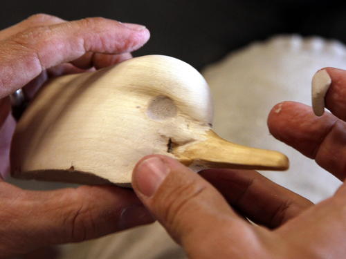 -             Use the micromotor to round out where the cheeks meet the bill. At this point, work the head up to where you like it, carving in any feather detail or groups you may want on the head. With a merganser, don’t get too much into the back of the head because this is where the crest is. Sand it once again. If you are going to hunt this bird and you used tupelo, coat the bill with liquid super glue at this point. The glue will soak into the wood pores and harden up, strengthening the bill tremendously. Let it set up before you do any more so it won’t get glued to your hand.