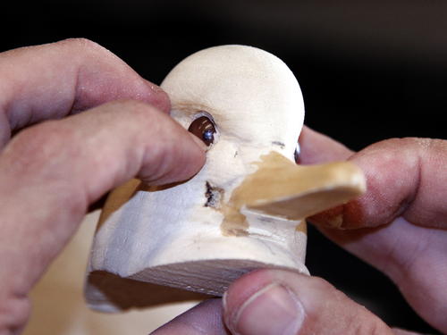 -             Set in the eye by pressing in the front and bottom slightly. You want the eye to appear as though it is looking at the end of the bill. Set both sides and view from both the top and front to make sure they are symmetrical. You should be able to see the pupil from the front. Don’t set them too deep, and don’t leave them bug-eyed.