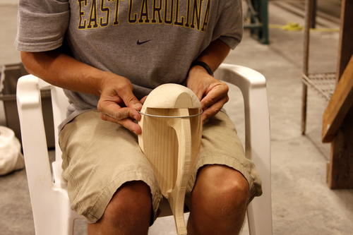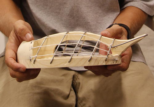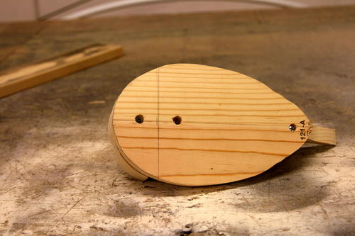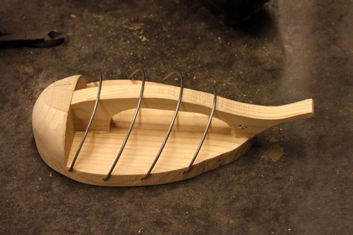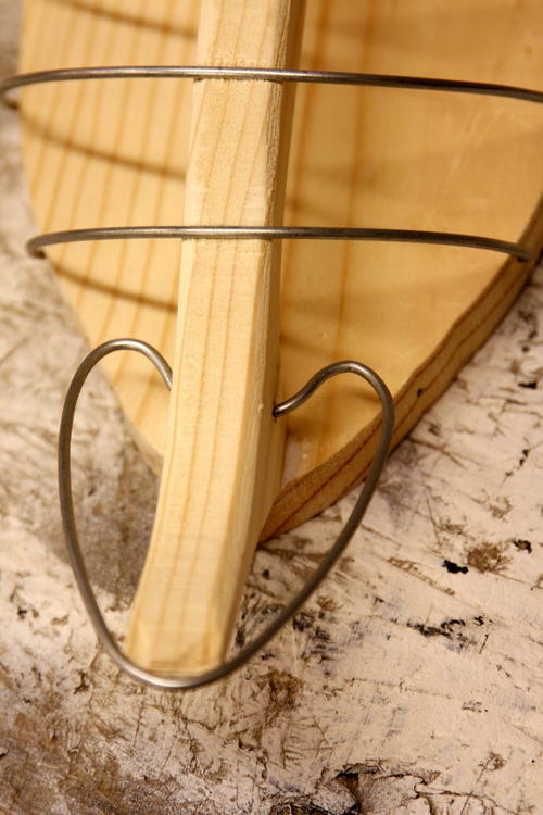 -             Cut six pieces of wire about 18 inches long. Working from the front rib on back, bend a piece of wire until it is half round. Work it over the decoy, rounding from the center rib on down to the bottom board. Use your fingers or a marker to note the point on the wire rib where it meets the anchor hole you drilled earlier.